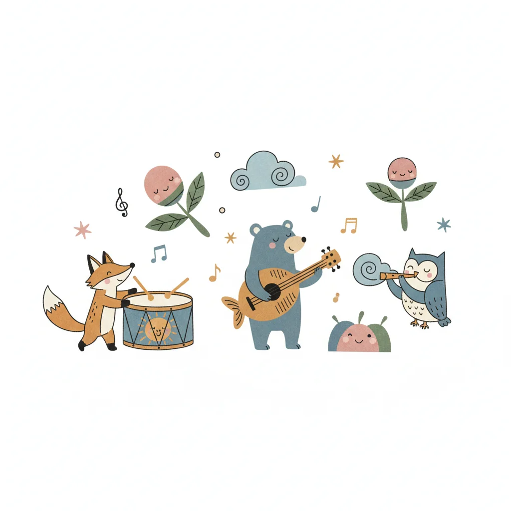 Tierische Musiker spielen Instrumente und genießen die Musik in der Natur.