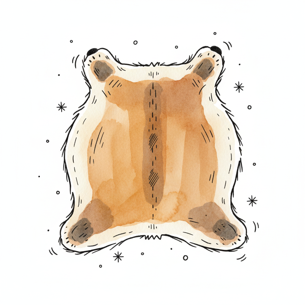Aquarell-Illustration eines braunen Tierfells, ausgebreitet wie ein Teppich, mit schwarzen Umrissen.