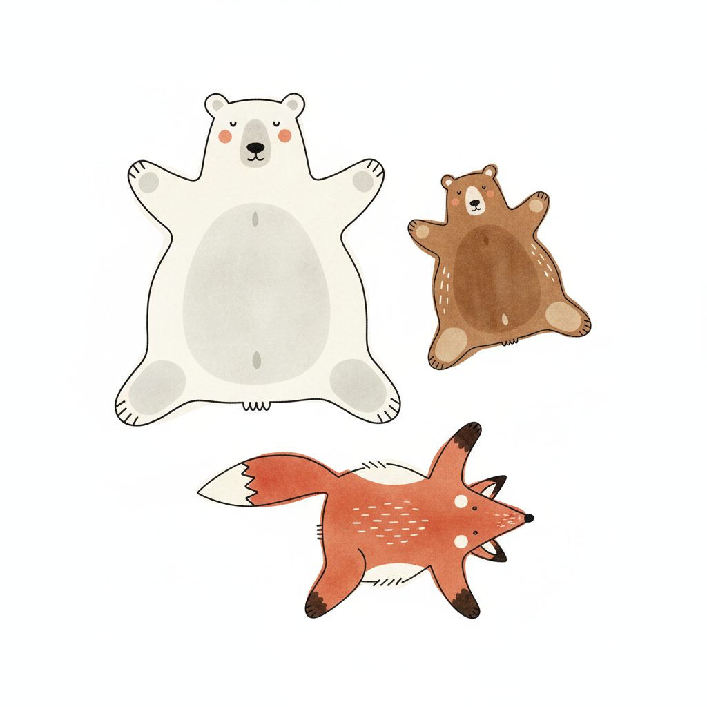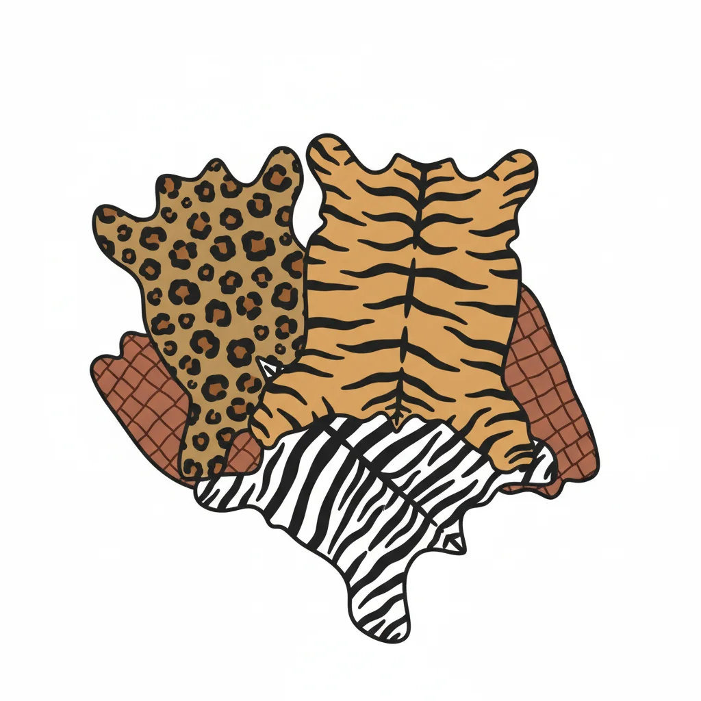 Illustration von drei Tierfellteppichen: Leopard, Tiger und Zebra, auf weißem Hintergrund.