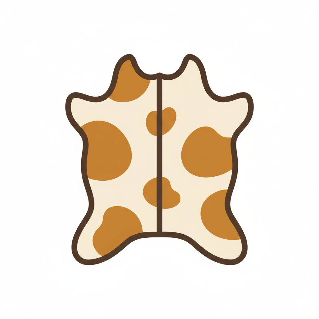 Stilisierte Illustration eines beigen Kuhfells mit braunen Flecken und dunkler Umrandung.
