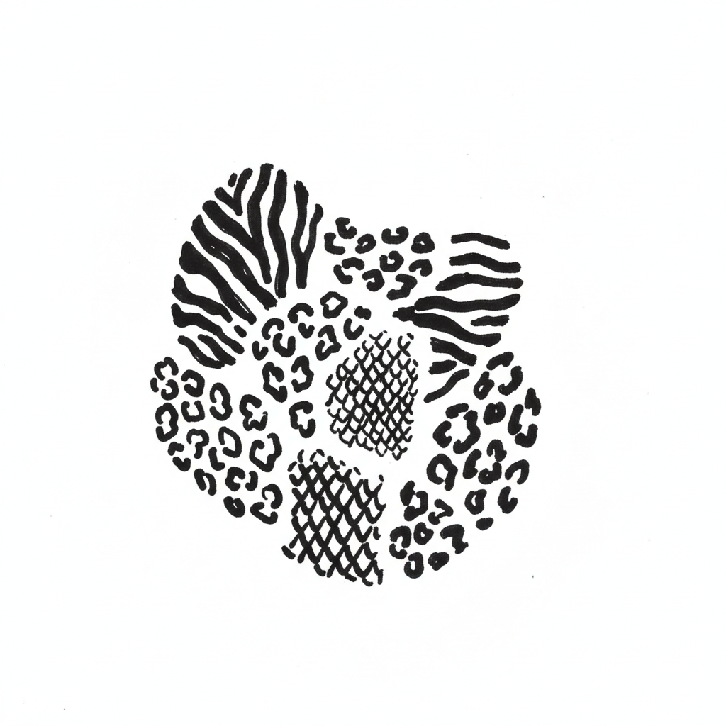Schwarz-weiße Illustration verschiedener Tiermuster wie Zebra, Leopard und Schlangenhaut.