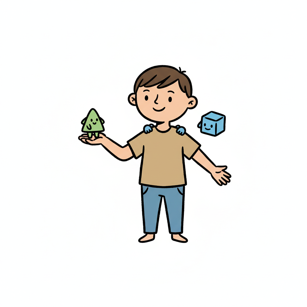 Lächelnder Cartoon-Junge hält grünes Dreieck, blauer Würfel schwebt daneben.