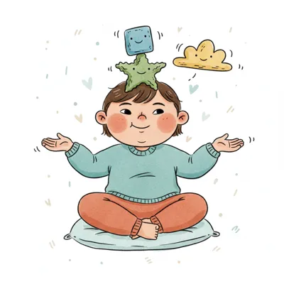 Kind sitzt meditierend mit balancierten Formen auf dem Kopf, eine lächelnde Wolke schwebt daneben.