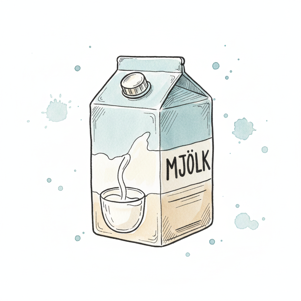 Aquarell-Illustration eines Milchkartons, aus dem Milch in ein Glas gegossen wird. Aufschrift: MJÖLK.