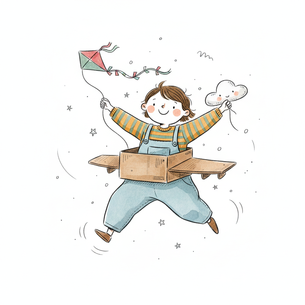 Fröhliches Kind in Kartonflugzeug mit Drachen und Wolkenballon, springt spielerisch.