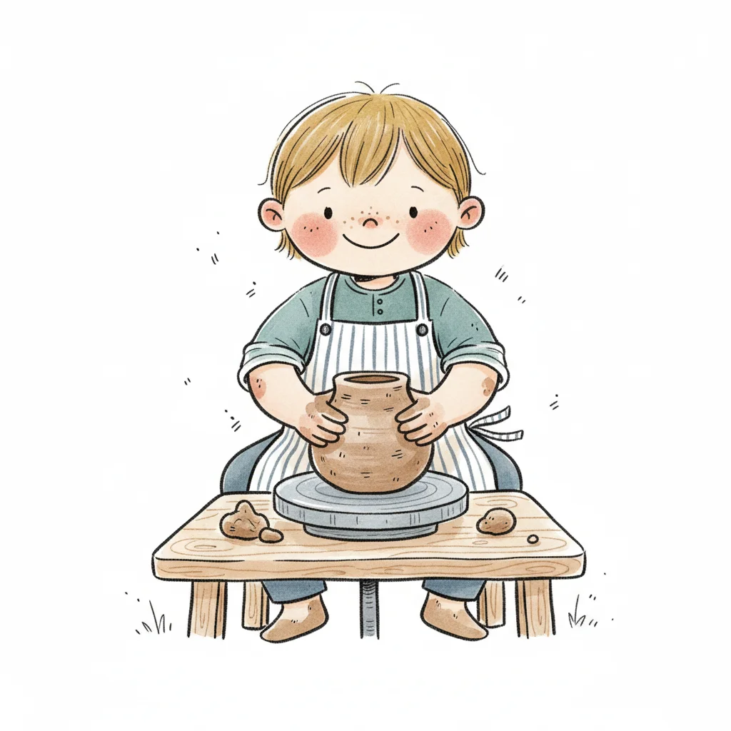 Ein lächelndes Kind mit Schürze töpfert einen Tonkrug an der Töpferscheibe im Aquarell-Stil.