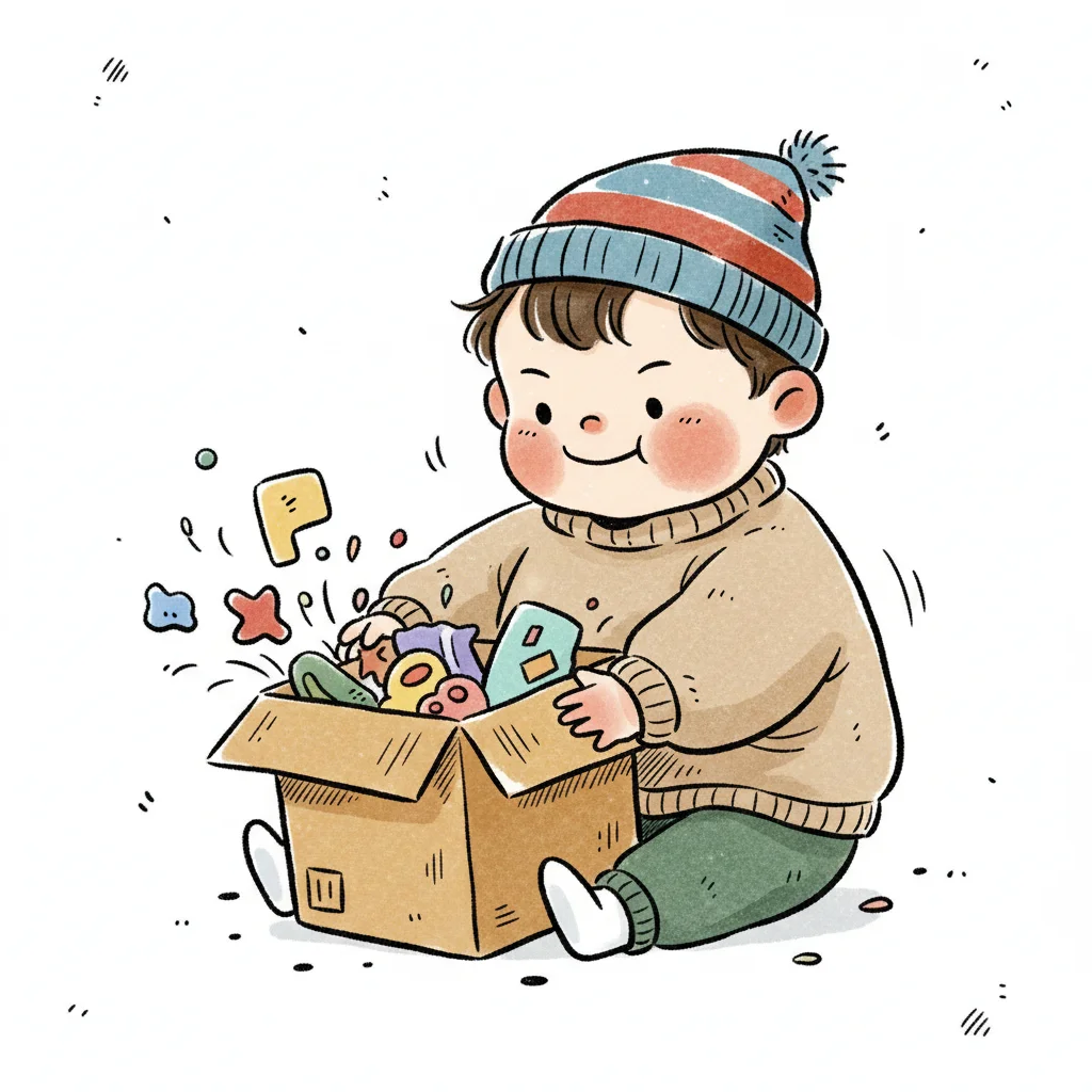 Niedliches Kind mit Mütze spielt fröhlich mit bunten Spielsachen in einem Karton.