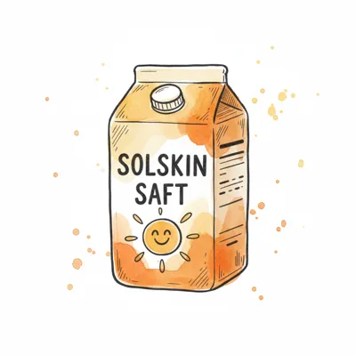 Aquarell-Illustration eines orangefarbenen Saftkartons mit "SOLSKIN SAFT" und lächelnder Sonne.
