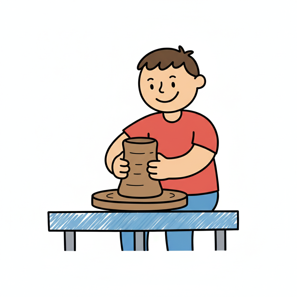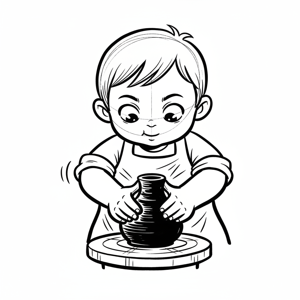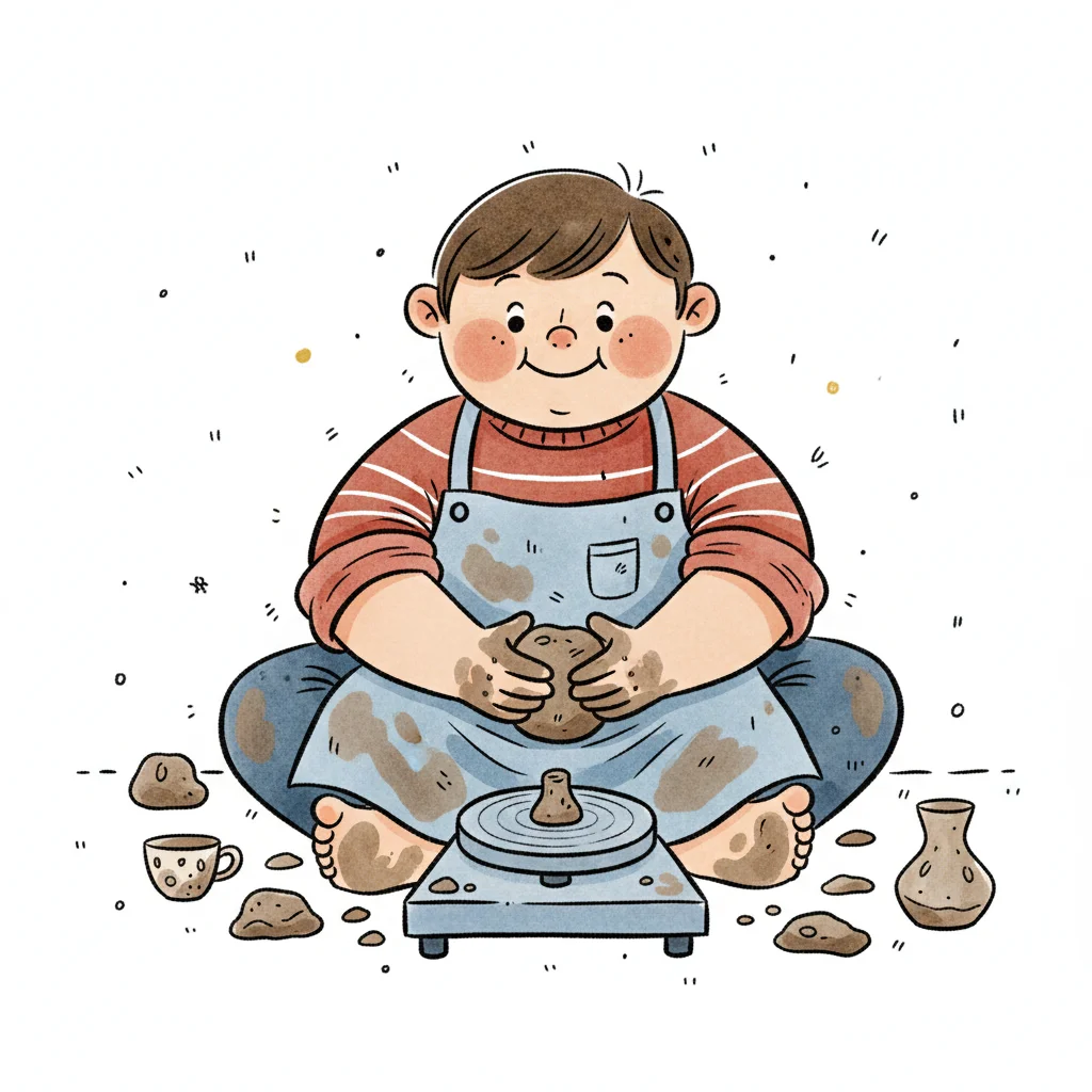 Ein Junge formt Töpferware mit einem Lächeln, umgeben von Tonresten.