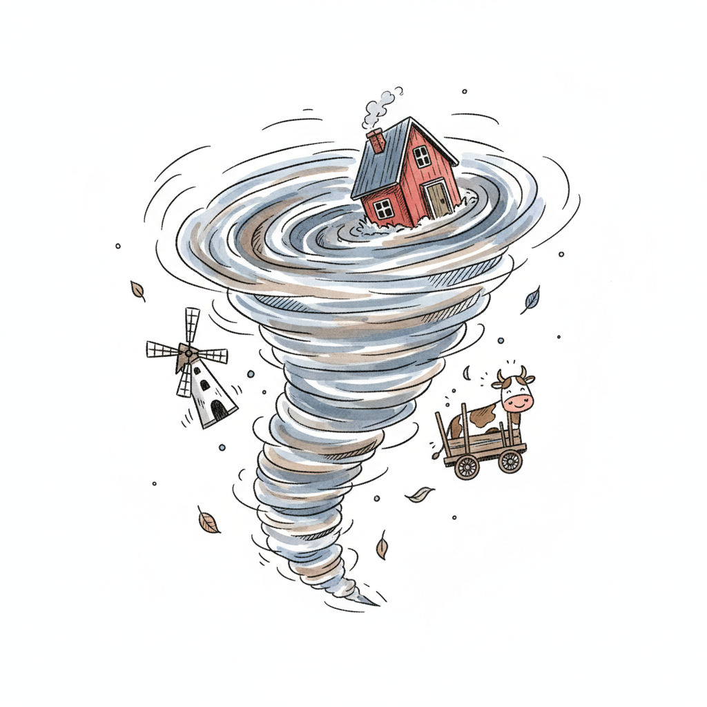 Ein cartoonhafter Tornado mit Häusern und Bäumen in einer wirbelnden Bewegung.