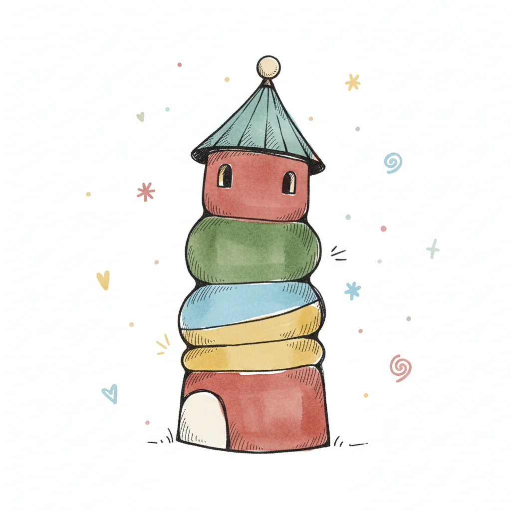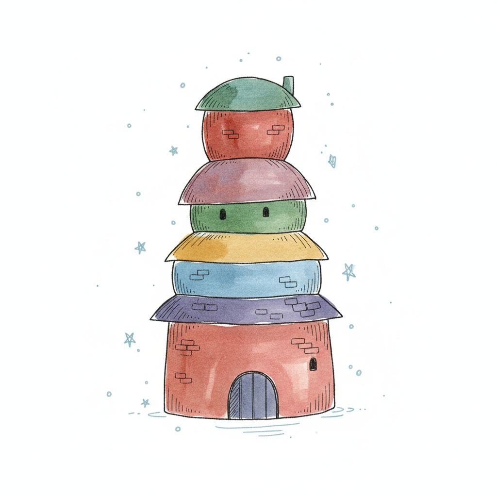 Niedlicher, bunter Turm im Aquarellstil mit gestapelten Segmenten und verspielten Details.