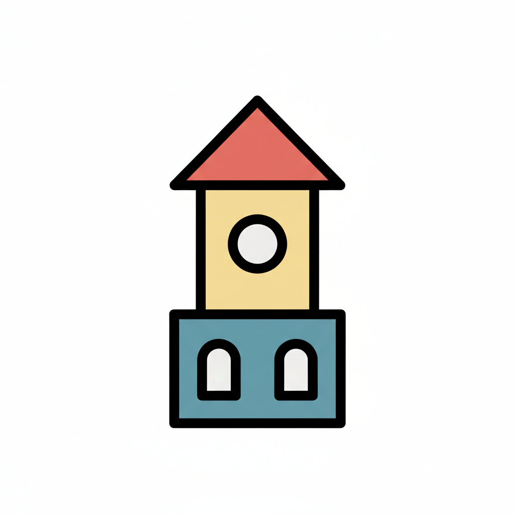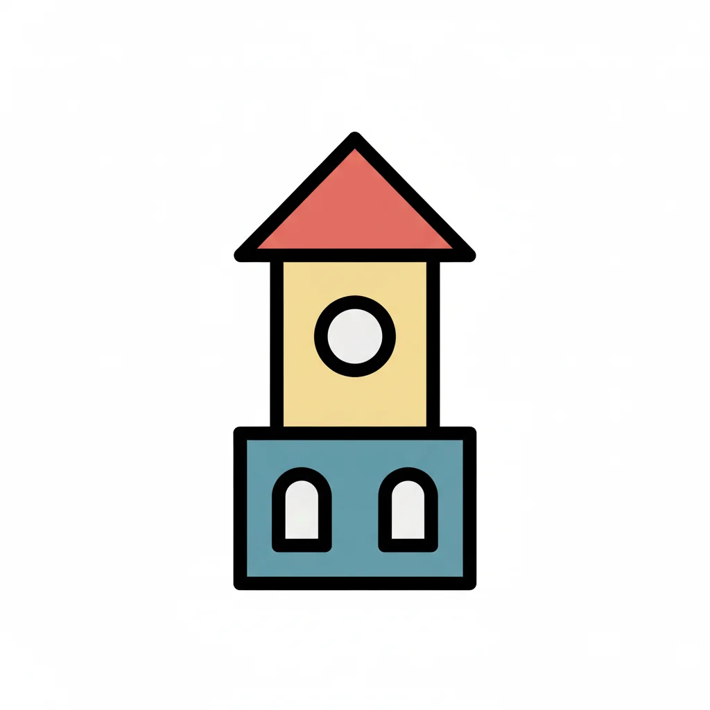 Buntes, stilisiertes Gebäude oder Turm mit rotem Dach, gelbem Mittelteil und blauer Basis.