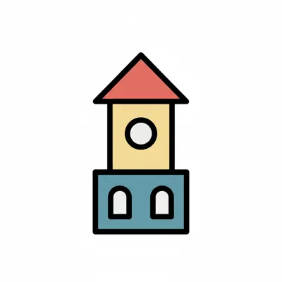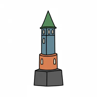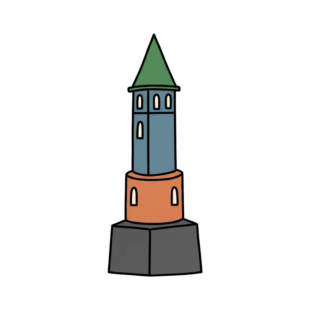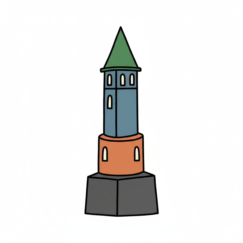 Stilisierter Turm in Blau, Orange und Grün mit spitzem Dach und kleinen Fenstern.