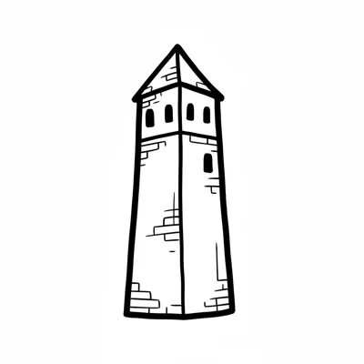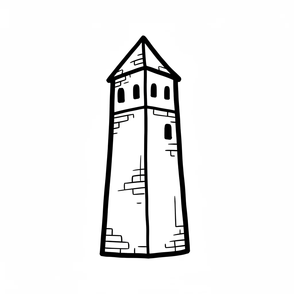 Handgezeichneter, schwarz-weißer Turm mit Ziegeldetails und spitzem Dach auf weißem Hintergrund.