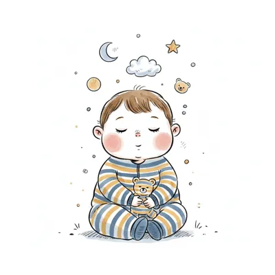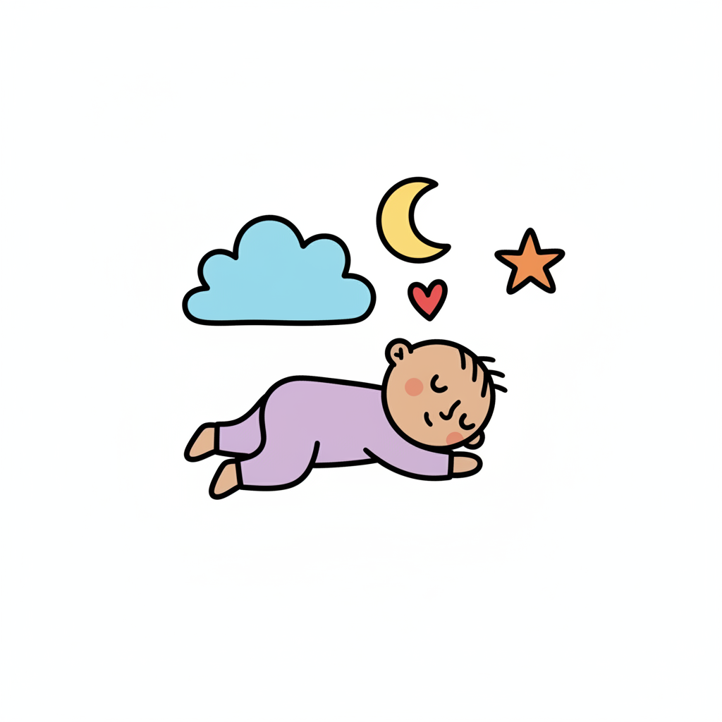 Ein schlafendes Baby mit Wolken, Mond und Sternen im Hintergrund.