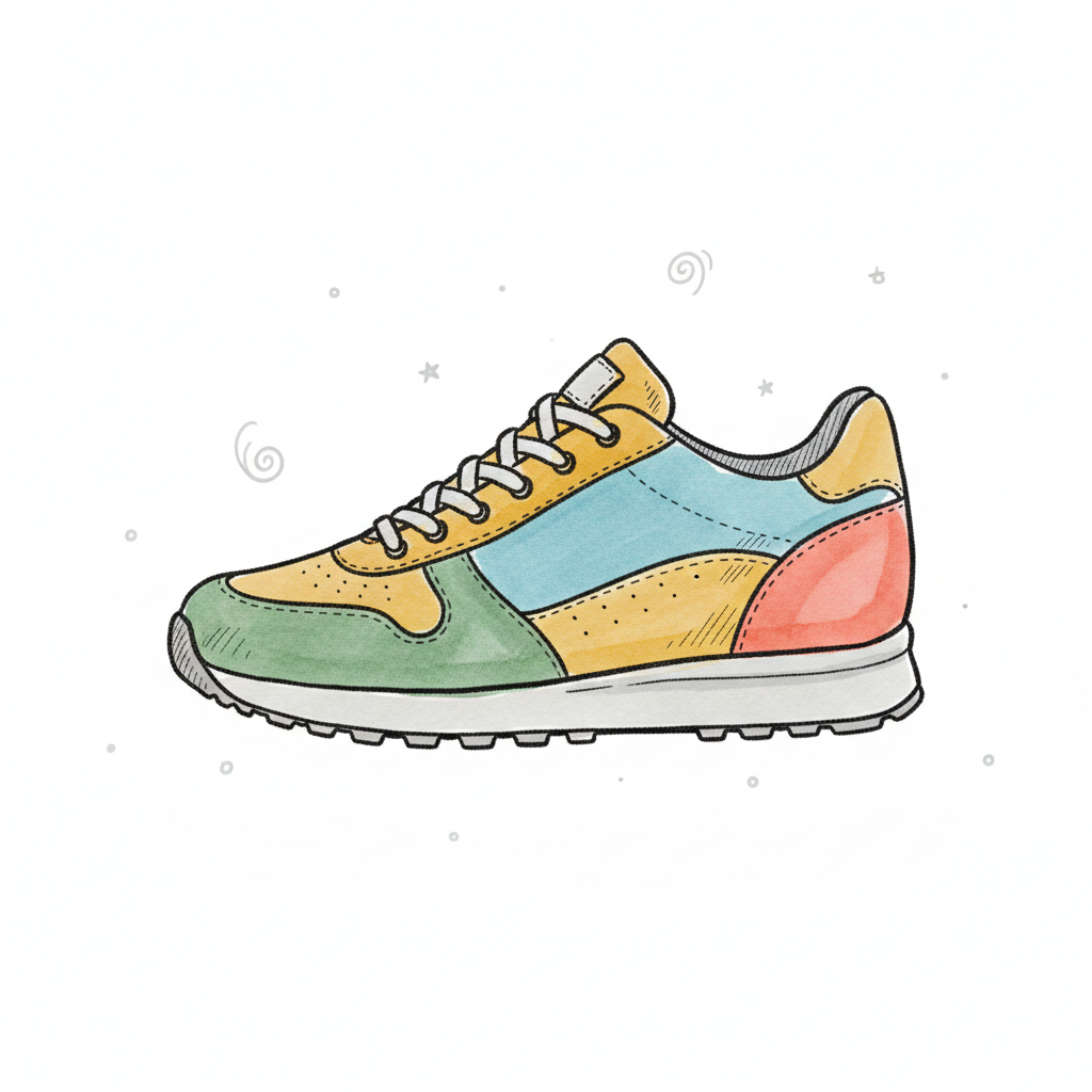 Handgezeichneter, bunter Sneaker in Gelb, Blau, Grün und Orange auf weißem Hintergrund.