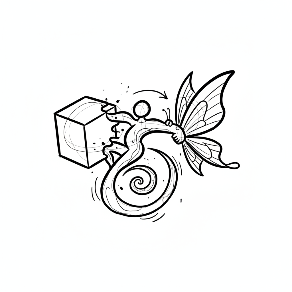 Stilisierte Figur mit Schmetterlingsflügeln verwandelt einen Würfel, symbolisiert Kreativität und Wandel.