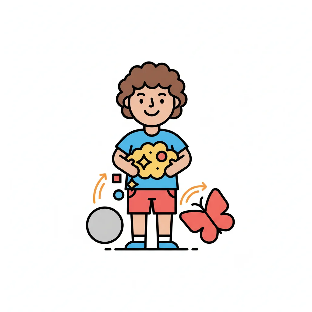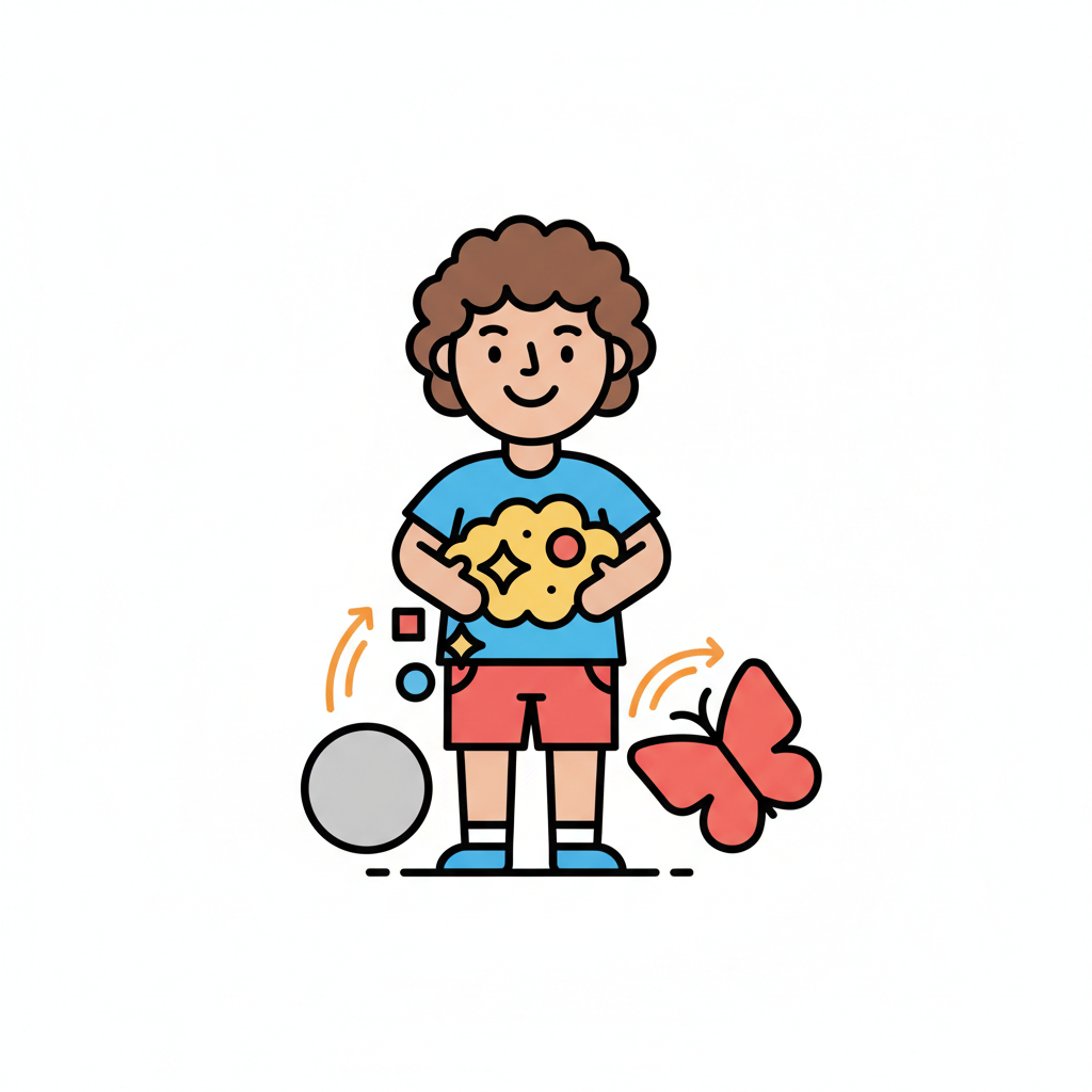Junge hält funkelnde Wolke, umgeben von Kreis und Schmetterling, symbolisiert Transformation.