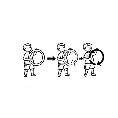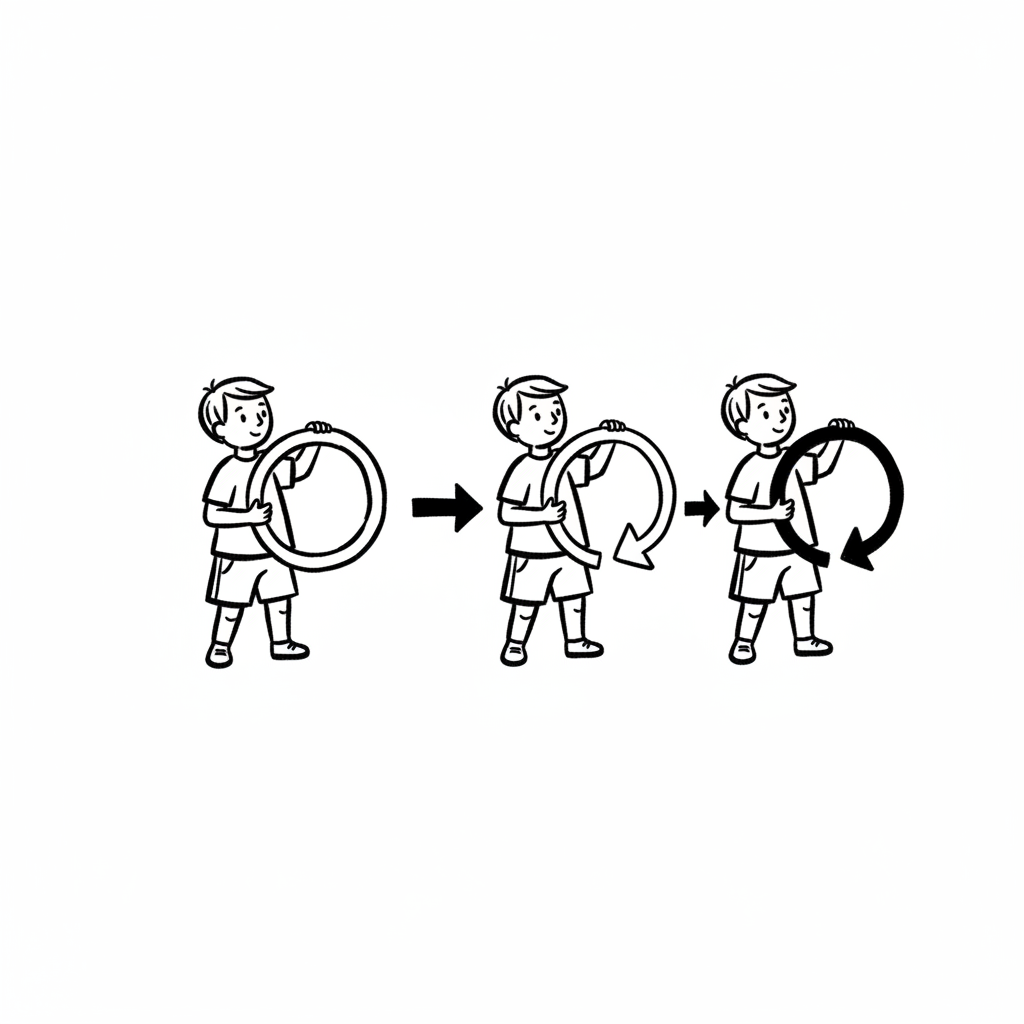 Ein Junge hält einen Ring, der sich schrittweise in einen schwarzen, kreisförmigen Pfeil verwandelt.
