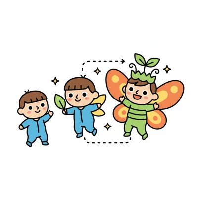 Drei niedliche Cartoon-Kinder, die sich von einem Baby zu einer Schmetterlingsfee entwickeln.
