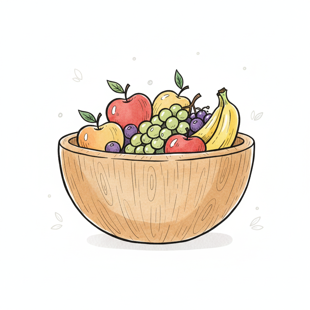 Eine Holzschüssel voller bunter Früchte wie Äpfel, Trauben und eine Banane.