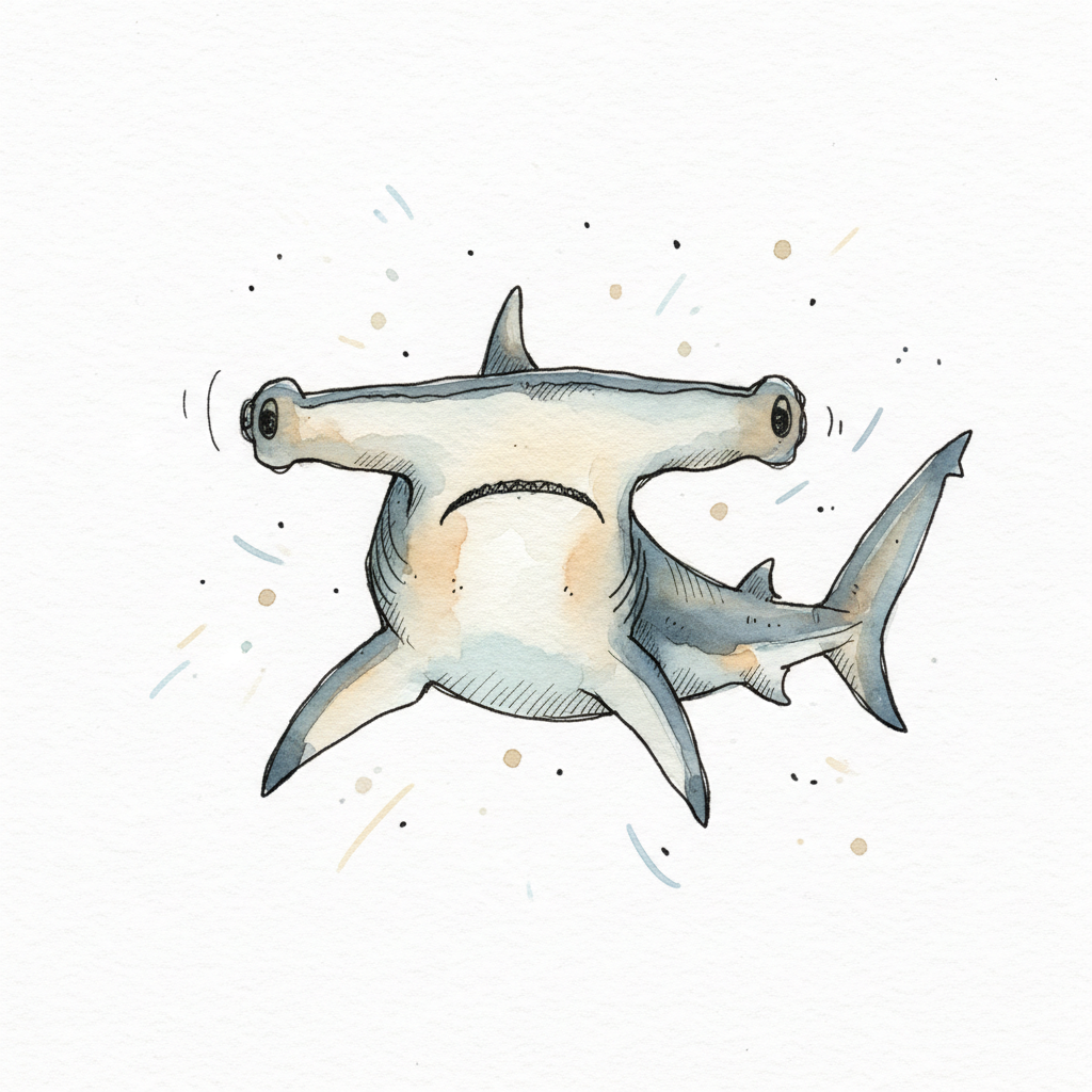 Aquarell-Illustration eines niedlichen, leicht traurigen Hammerhais auf weißem Grund.