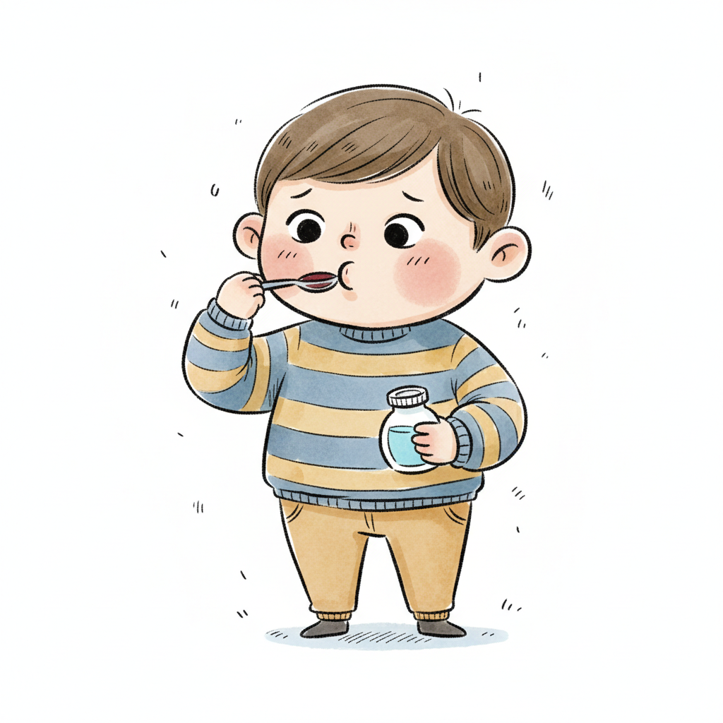 Ein trauriger Junge nimmt widerwillig Medizin von einem Löffel, hält eine Flasche in der Hand.