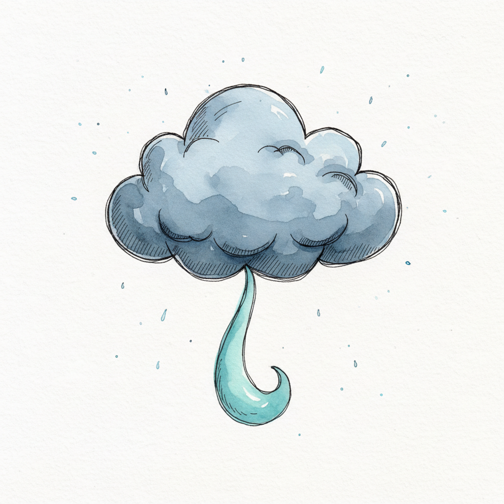 Niedliche Aquarell-Illustration einer grauen Wolke, aus der ein großer, blauer Regentropfen fällt.