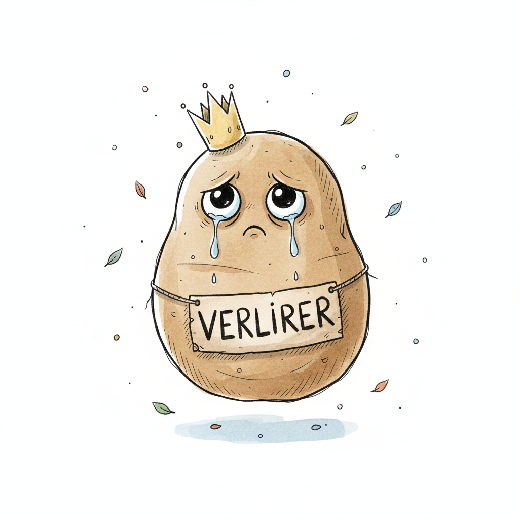 Weinende Kartoffel mit Krone und "VERLIERER"-Schild.