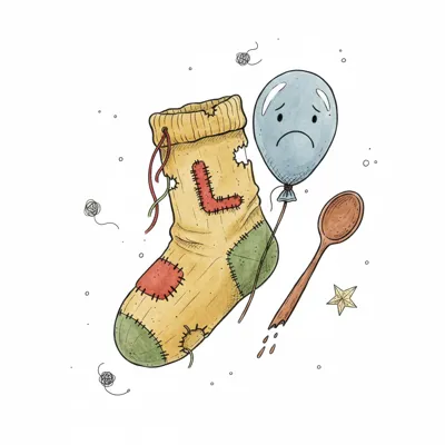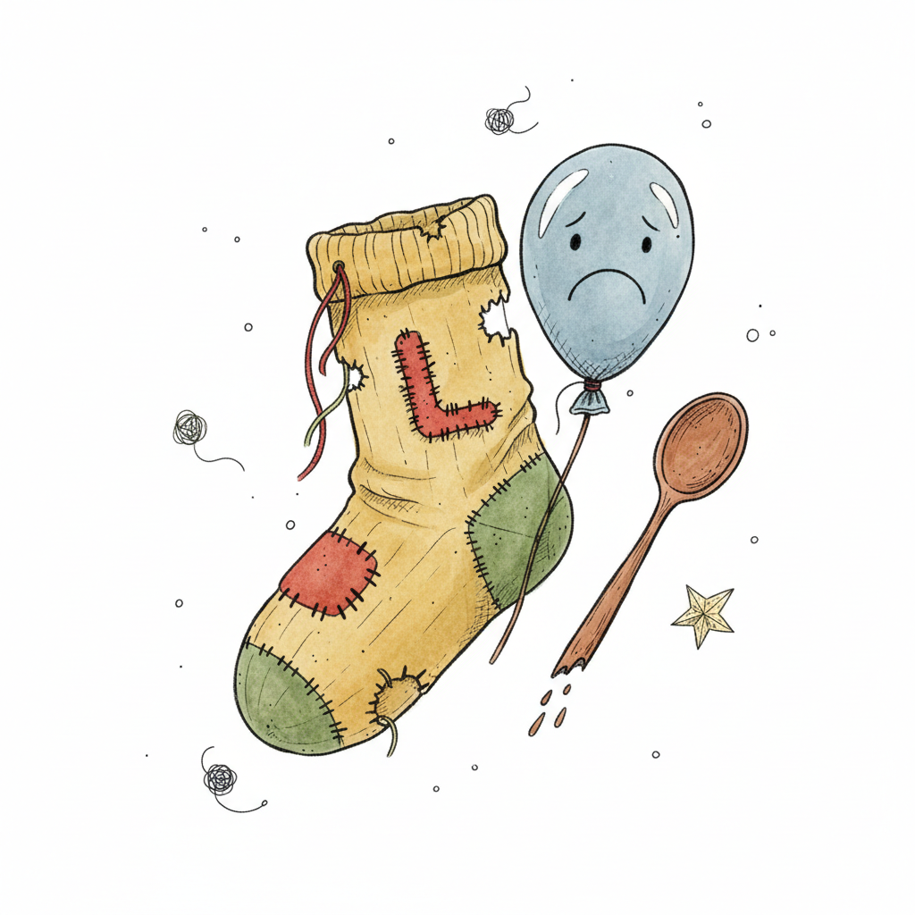 Melancholische Illustration mit kaputtem Socken, traurigem Ballon und zerbrochenem Löffel.