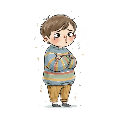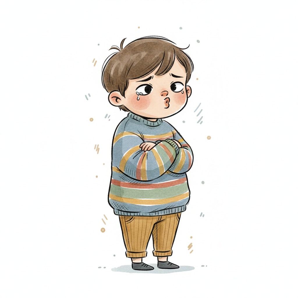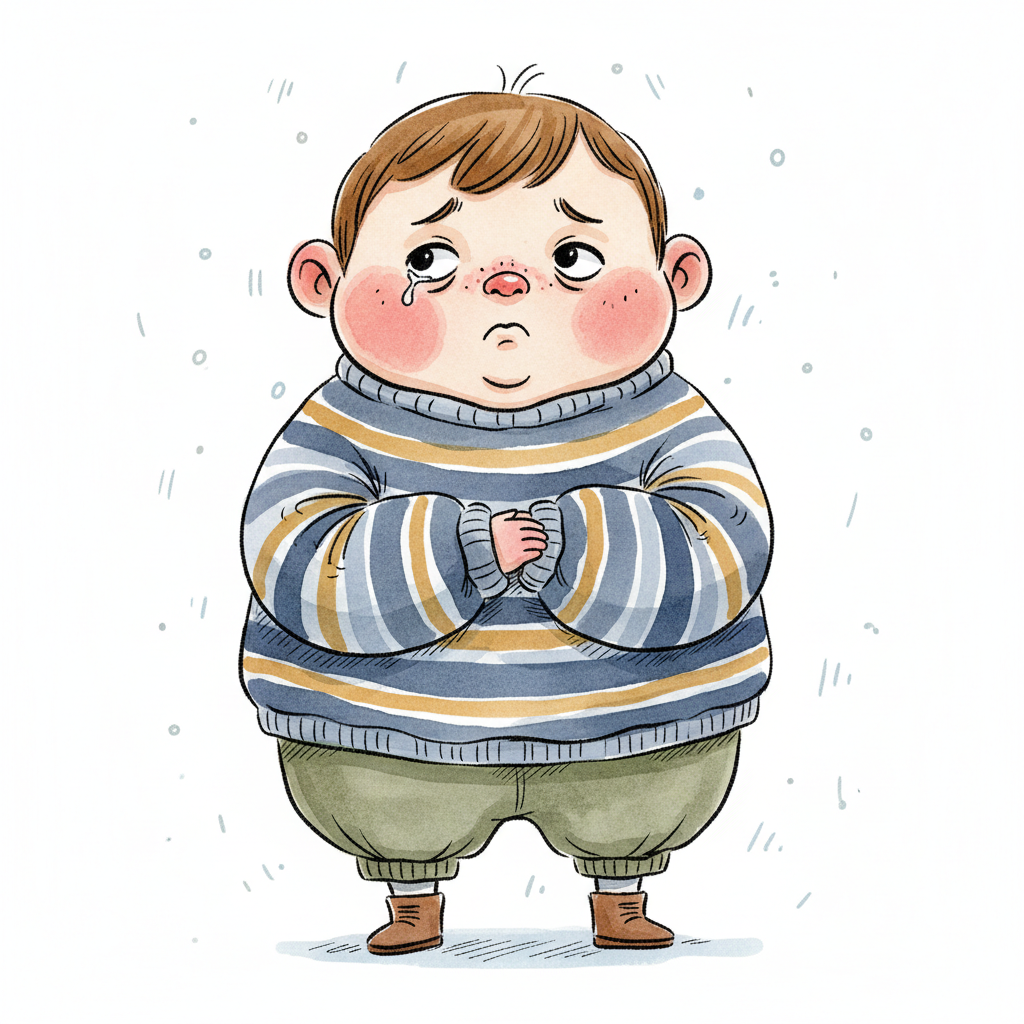 Ein weinender, molliger Cartoon-Junge in einem gestreiften Pullover mit gefalteten Händen.
