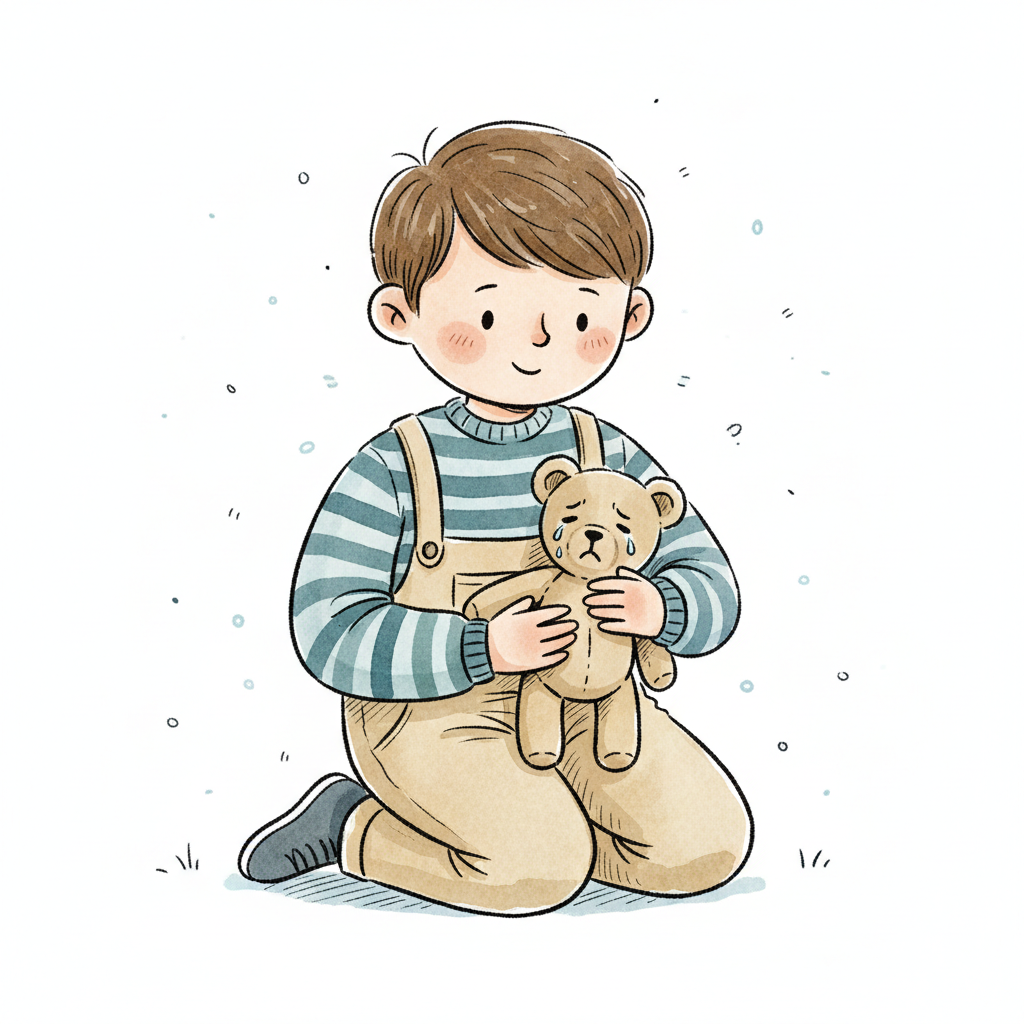 Ein trauriges Kind tröstet seinen weinenden Teddybär mit einem Taschentuch unter einer Regenwolke.