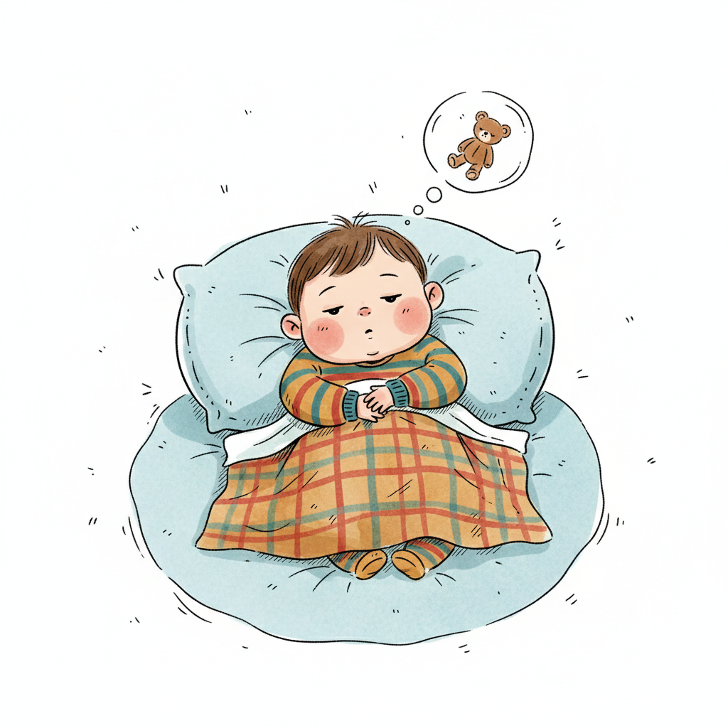 Niedliches Baby liegt im Bett, leicht traurig, träumt von Teddybär.