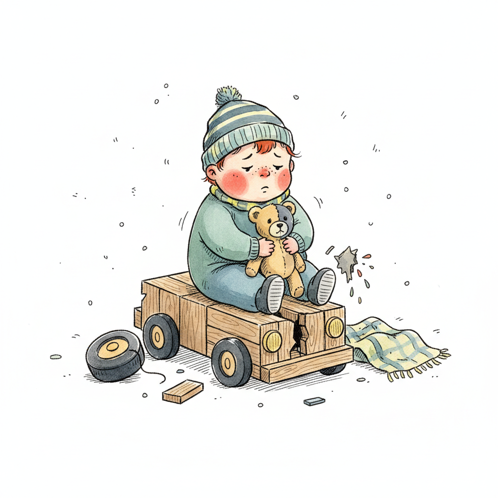 Ein trauriges Kind sitzt auf einem kaputten Holzauto und hält einen Teddybär.
