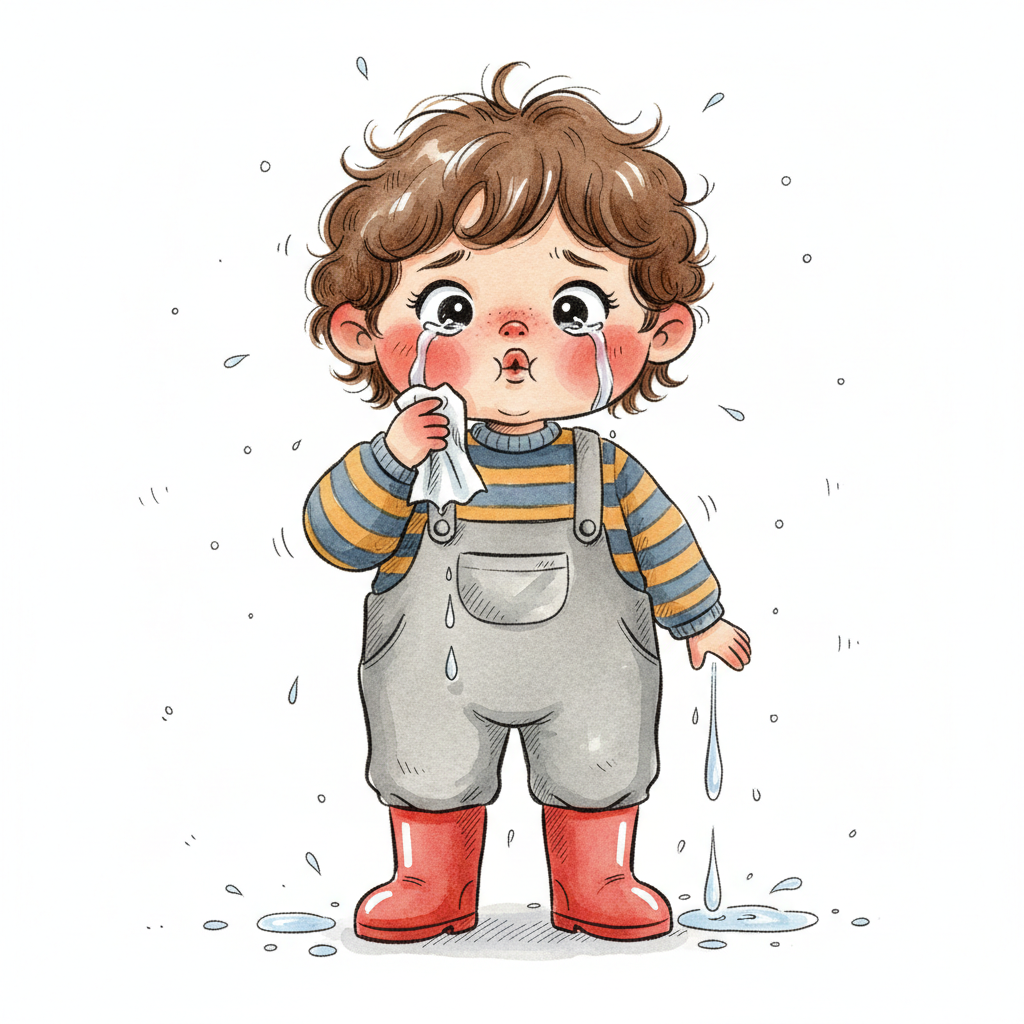 Ein weinendes Kleinkind in Latzhose und Gummistiefeln, Tränen fließen und es hält ein Taschentuch.