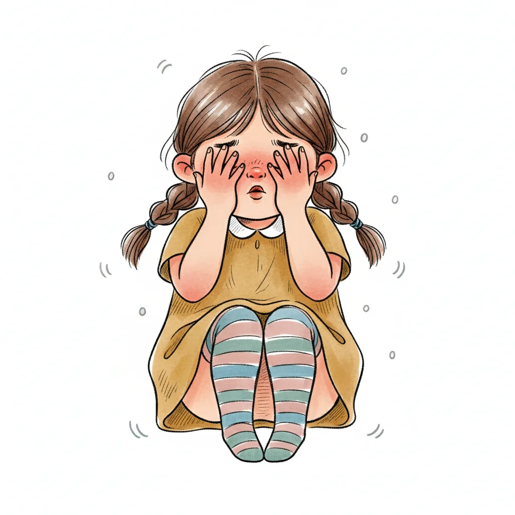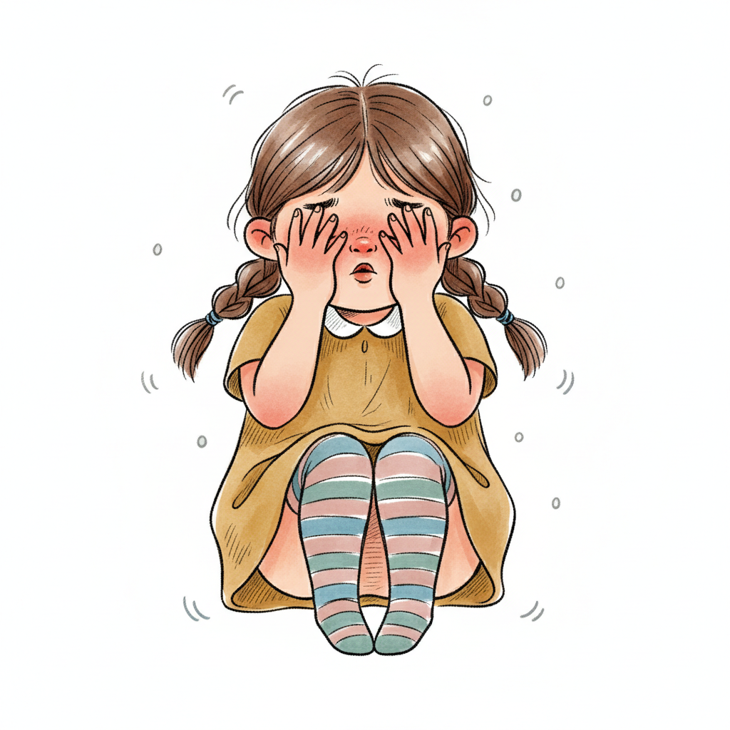 Ein kleines Mädchen mit Zöpfen bedeckt ihr Gesicht mit den Händen, wirkt verlegen oder weinend.