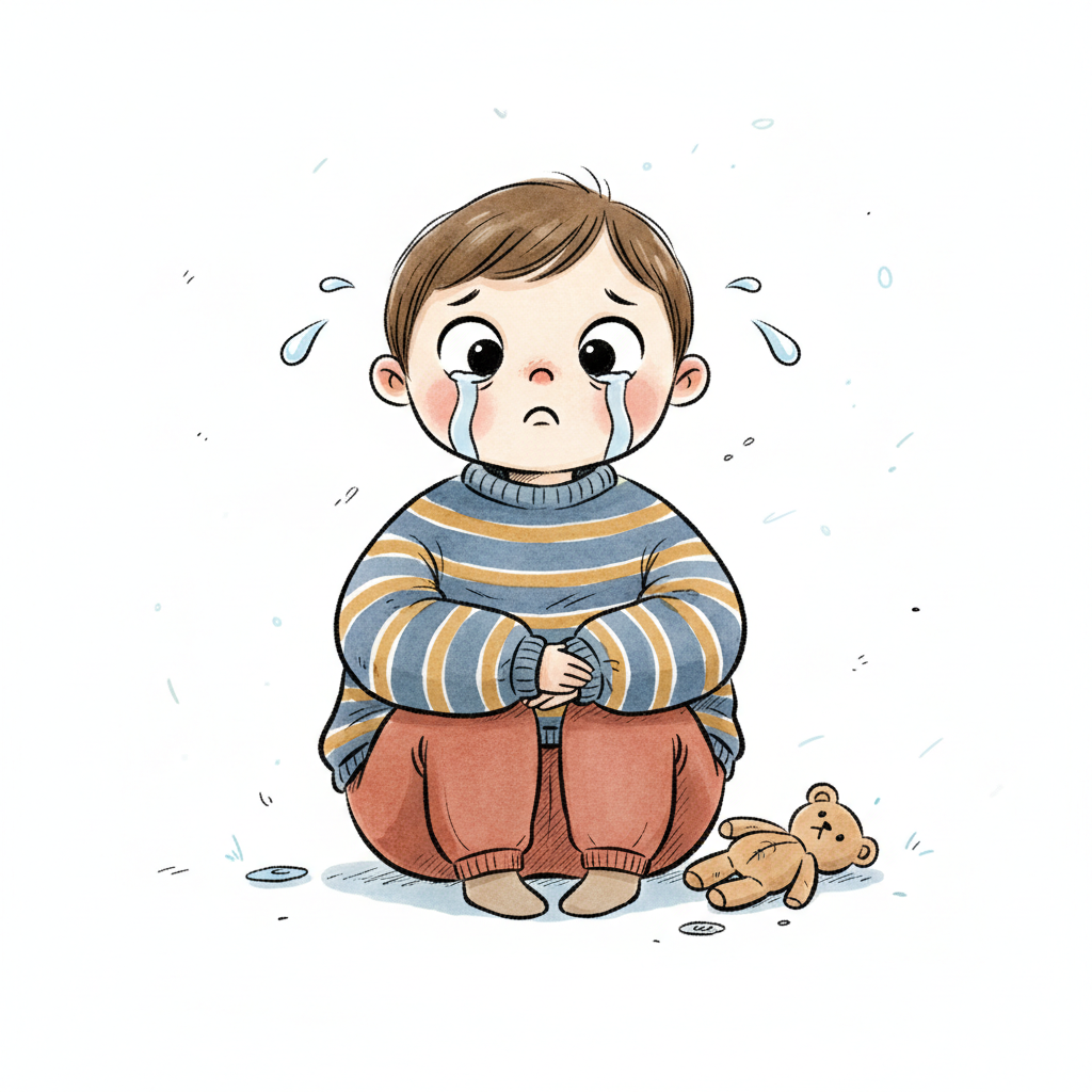 Ein trauriger Junge sitzt und weint, sein Teddybär liegt am Boden. Illustration.