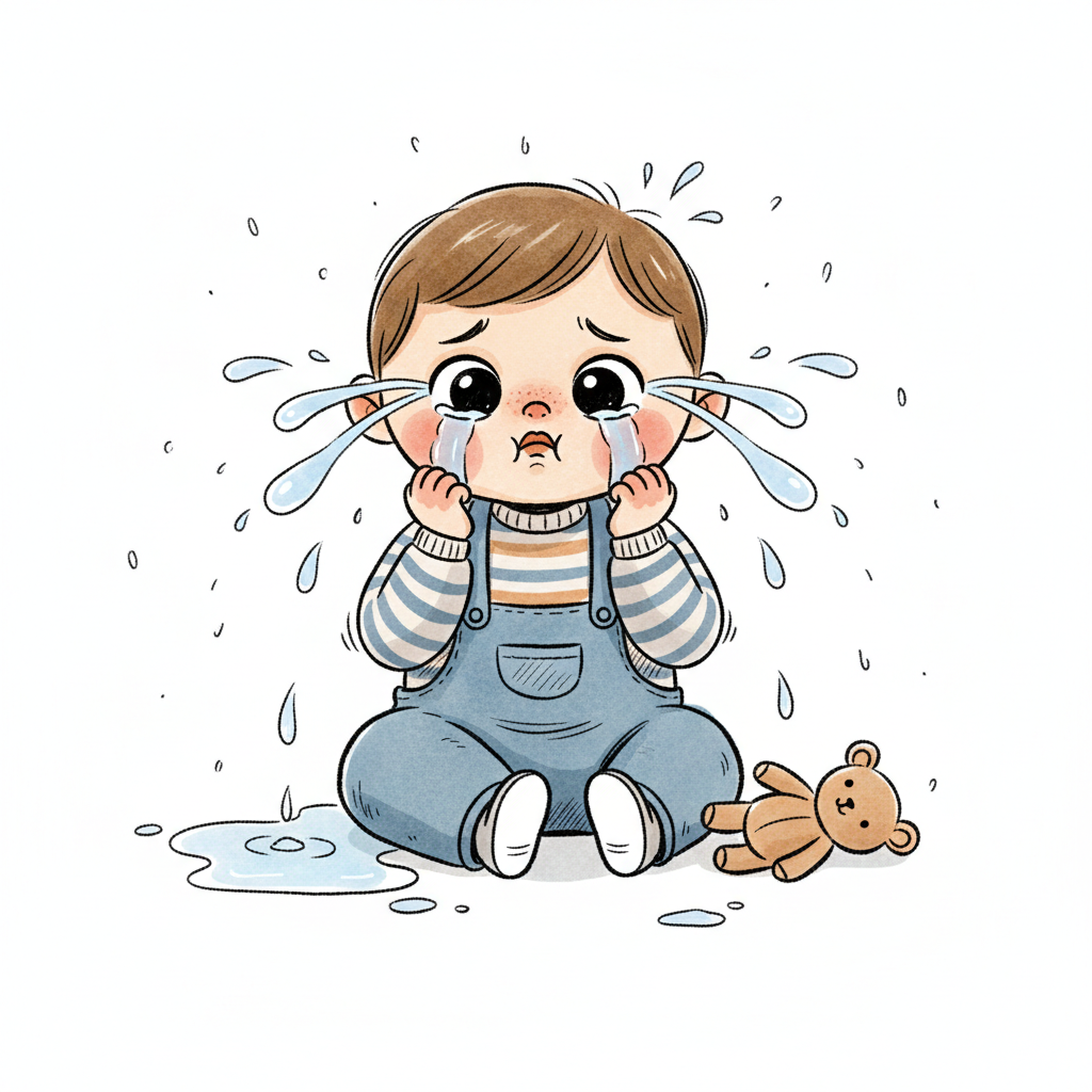 Cartoon-Baby weint herzzerreißend, Tränen spritzen, Teddybär liegt daneben.