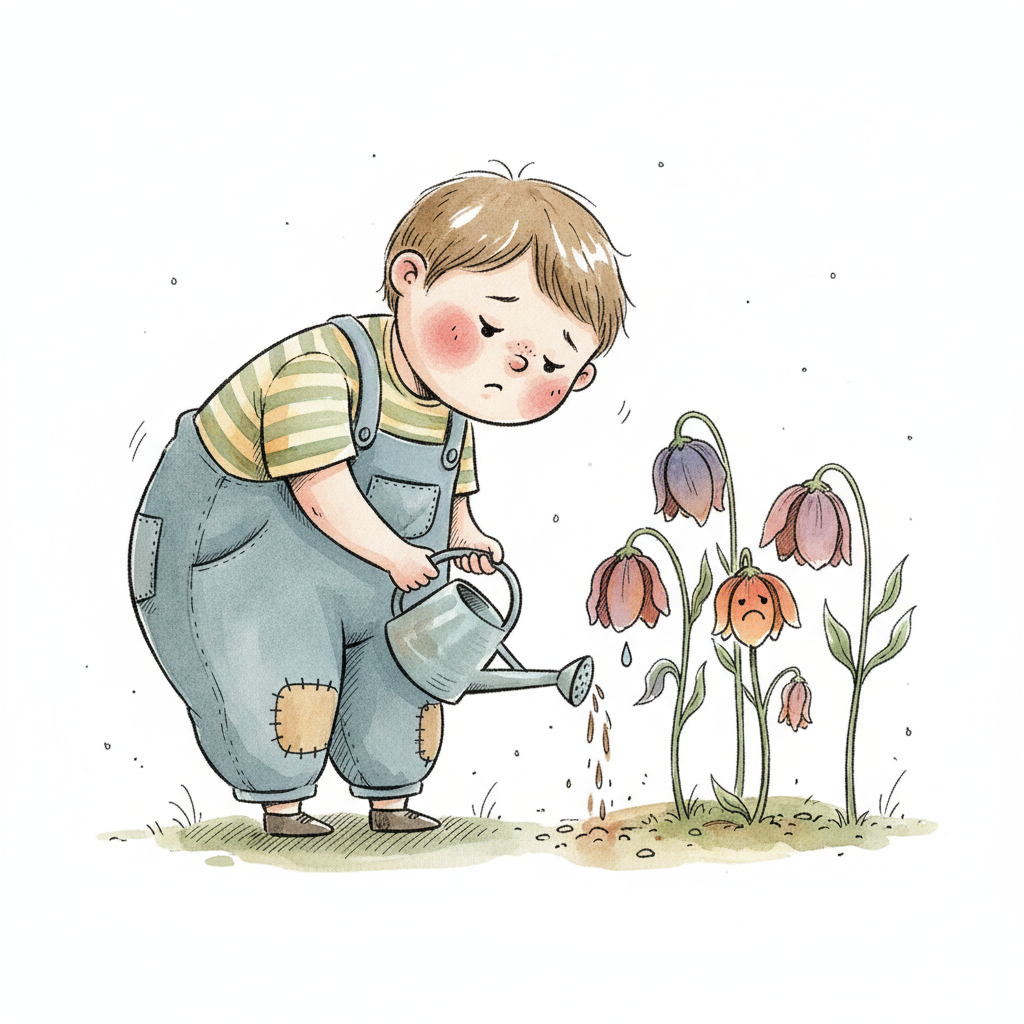 Trauriger Junge gießt welke Blumen; eine Blume hat ein trauriges Gesicht.