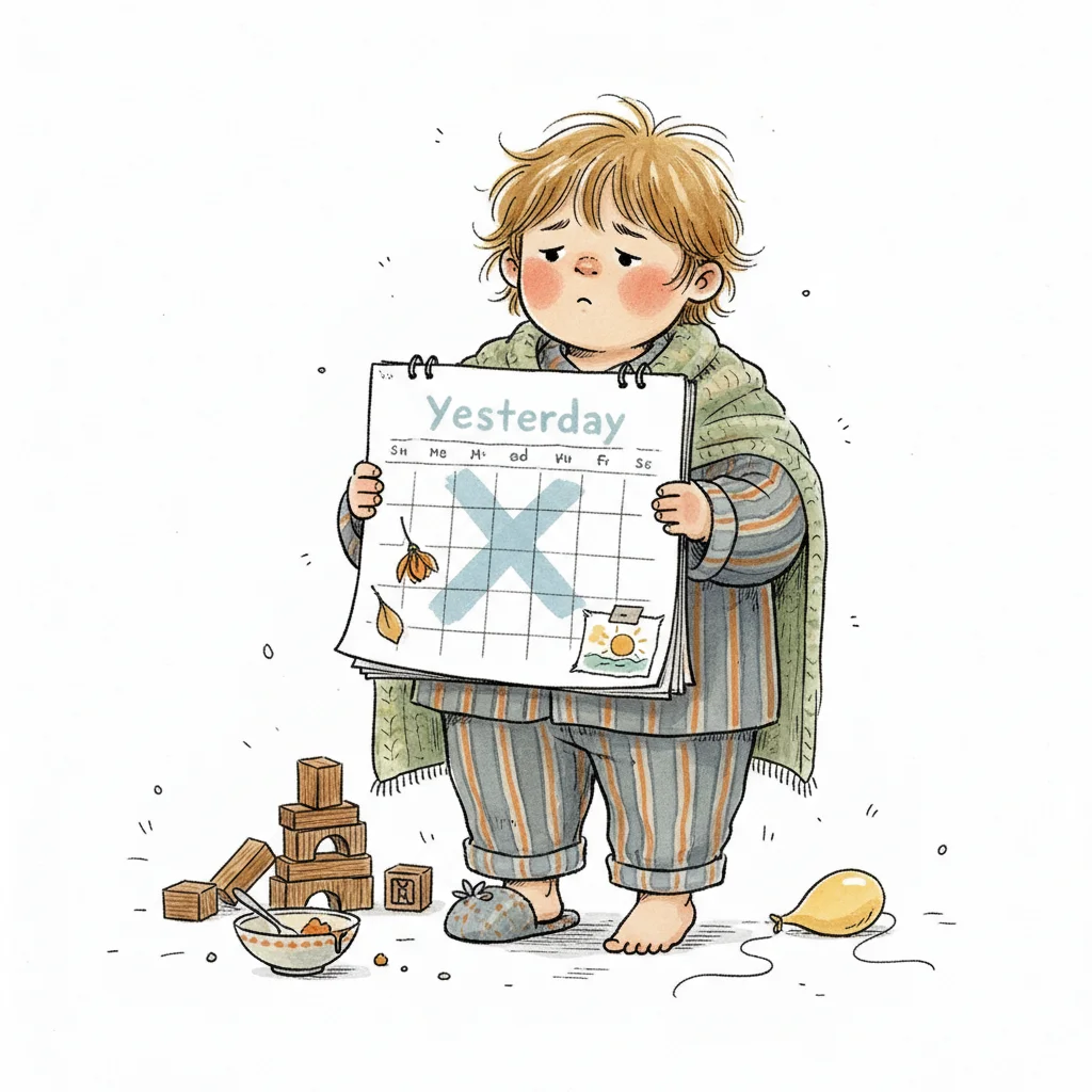 Trauriges Kind in Schlafanzug hält Kalenderblatt "Yesterday" mit großem X.