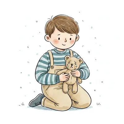 Ein lächelnder Junge kniet und hält einen traurigen Teddybär. Aquarell-Illustration.