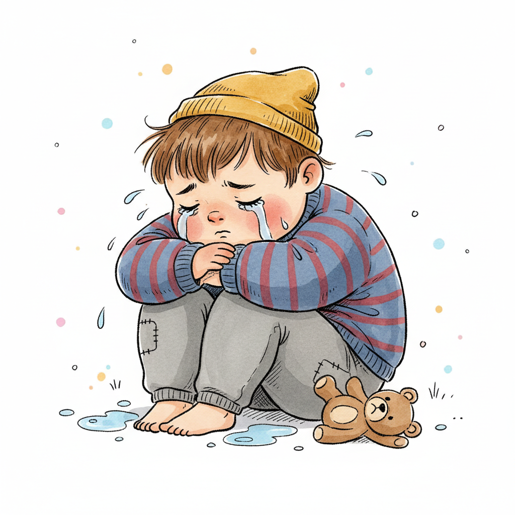 Ein trauriger Junge sitzt weinend mit einem Teddybär.