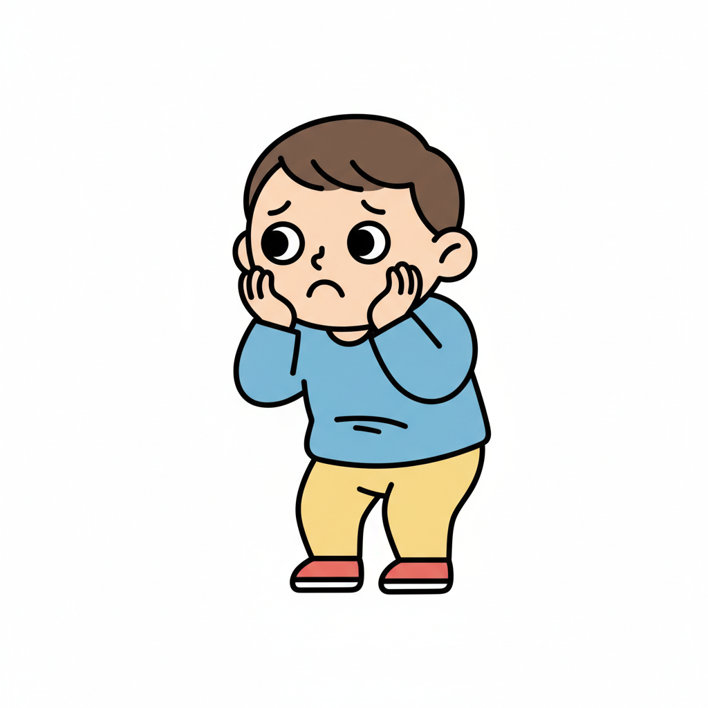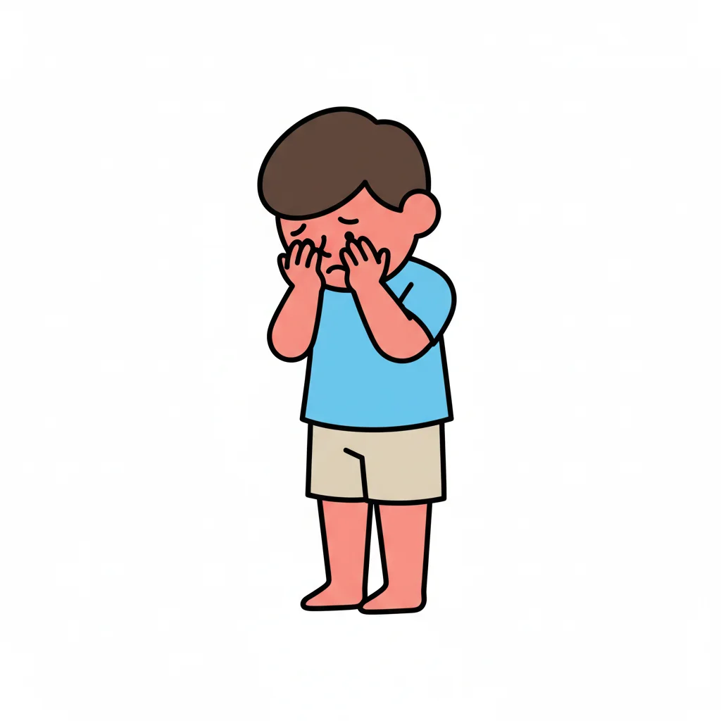 Ein trauriger Junge mit besorgtem Ausdruck steht mit Händen im Gesicht.