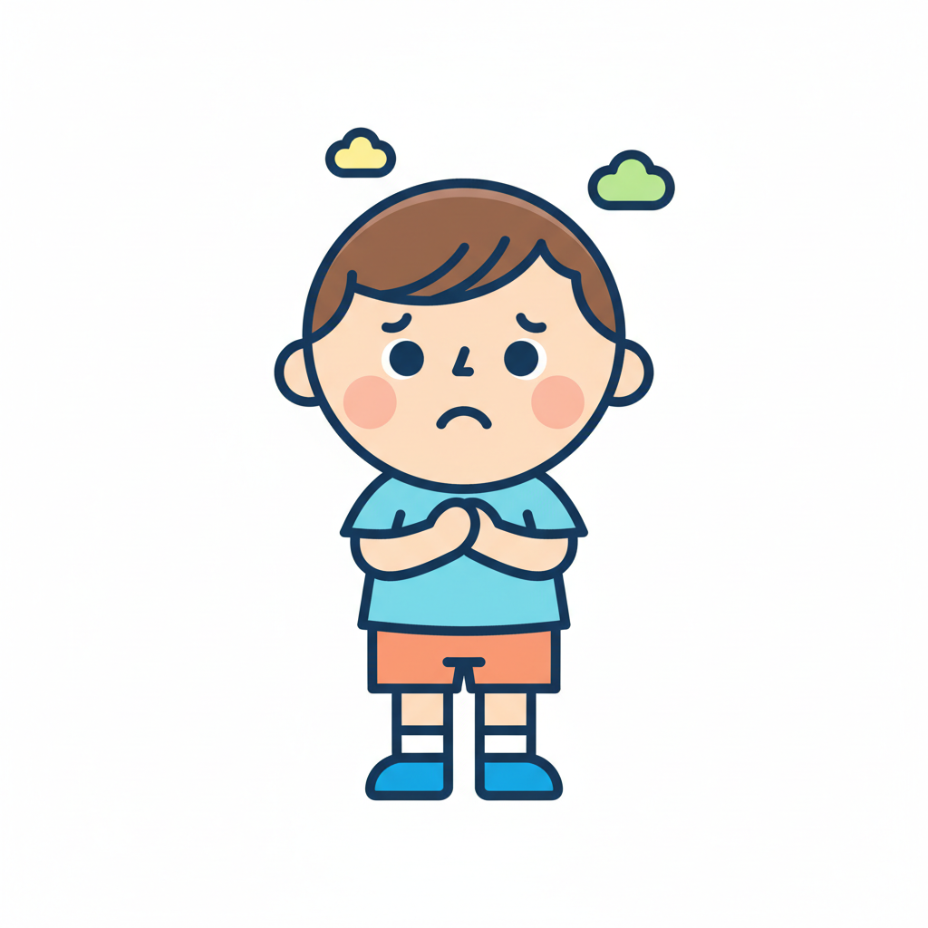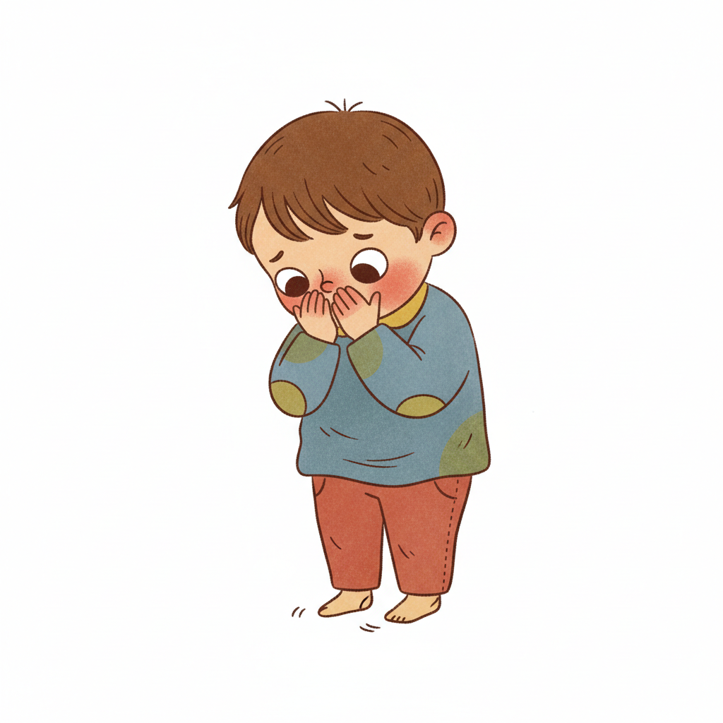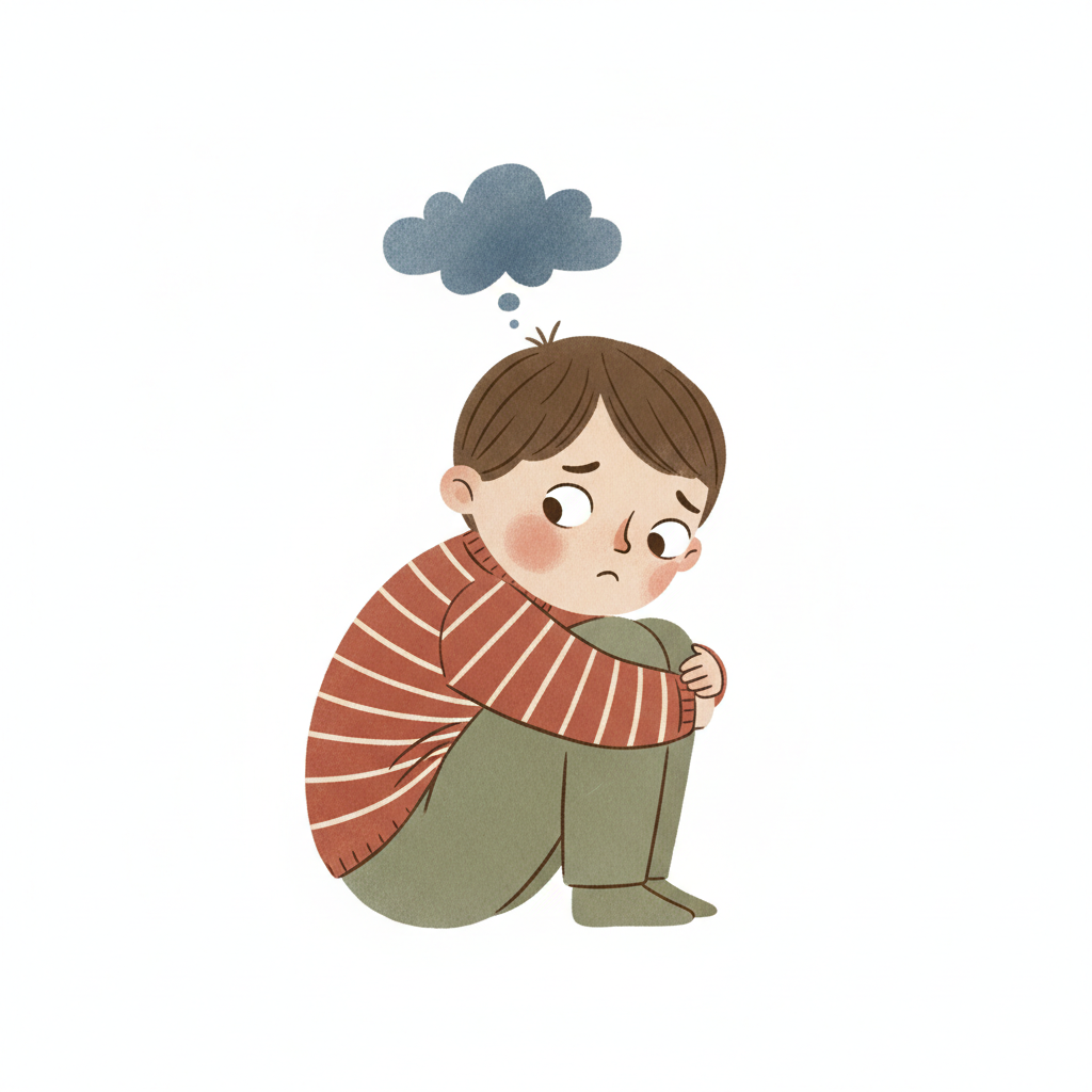 Handgezeichnete Kinderbuchillustration im modernen skandinavisch-nordischen Stil. Minimalistische, freundliche Figur mit einfachen Formen und leicht unregelmäßigen, handgezeichneten Linien. Ruhige, gedeckte Farbpalette, viel freie Fläche, reduzierte Details, sanfte Papier- oder Aquarellstruktur. Warme, ruhige, leicht humorvolle Stimmung, flächige Komposition ohne starke Perspektive, moderner nordischer Illustrationsstil, charmant und zeitlos.