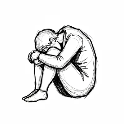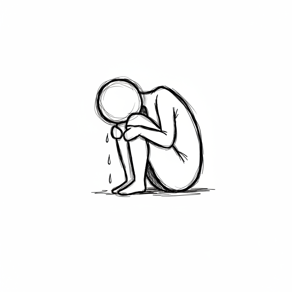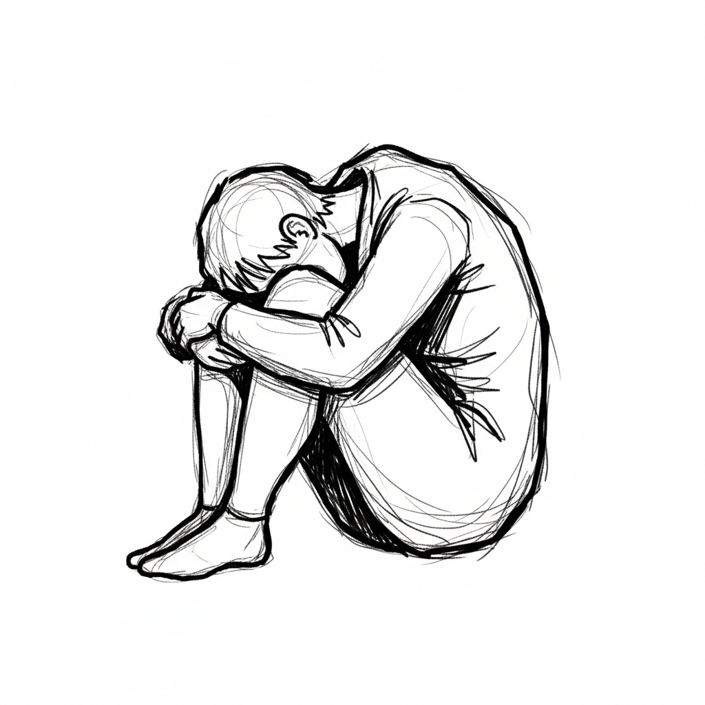 Eine triste zeichnerische Darstellung einer sitzenden, nachdenklichen Person.