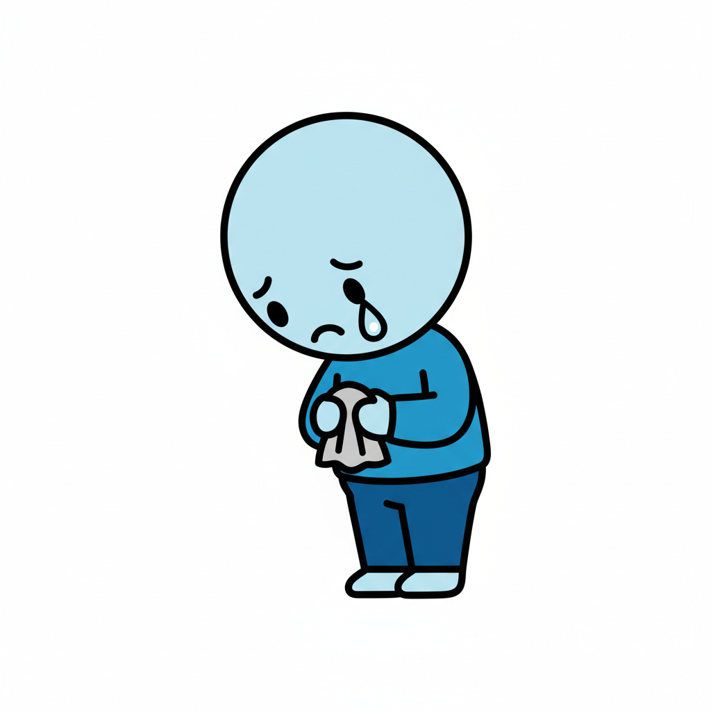 Ein blauer, trauriger Charakter weint und hält ein Taschentuch.