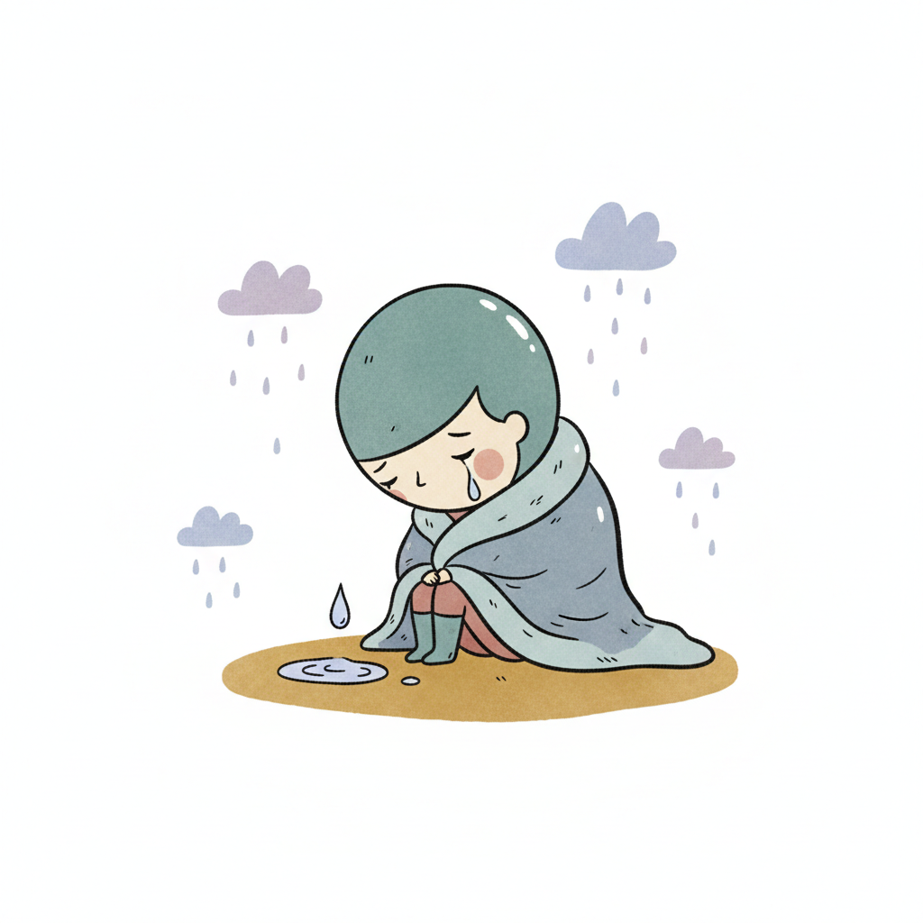 Ein trauriges Kind sitzt unter Regen, eingehüllt in eine Decke.