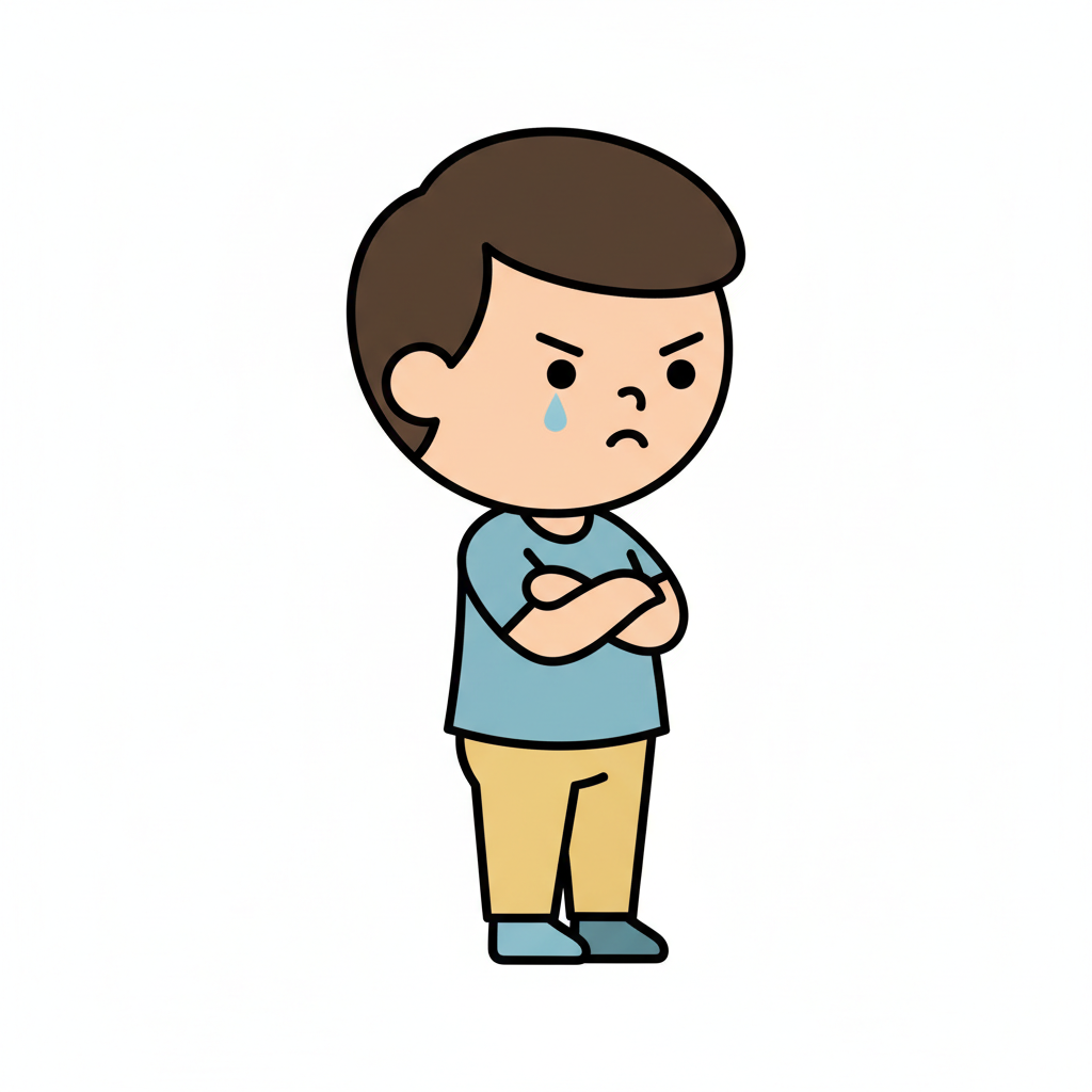 Ein trauriger Junge mit verschränkten Armen und einer Träne.