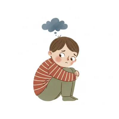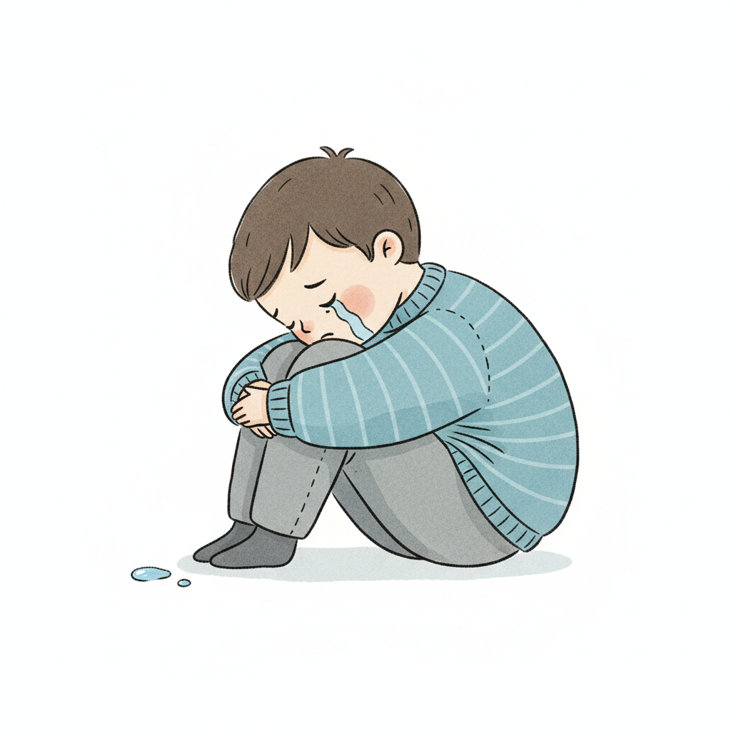 Ein trauriger Junge sitzt gekrümmt und weint leise.