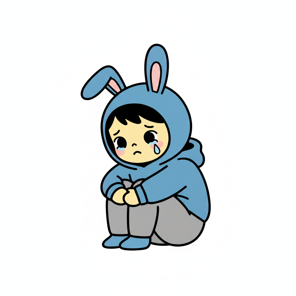 Ein Kind in einem Hasen-Overall sitzt traurig und weint.
